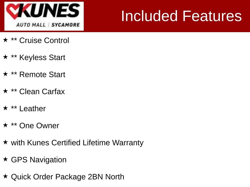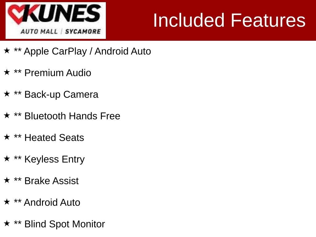 *While we make every effort to ensure the data listed here is correct, there may be instances where some of the incentives, options or vehicle features may be listed incorrectly as we get data from multiple data sources. PLEASE MAKE SURE to confirm the details of this vehicle with the dealer to ensure its accuracy. Dealer cannot be held liable for data that is listed incorrectly. * MSRP is the Manufacturer's Suggested Retail Price (MSRP) of the vehicle. It does not include any tax, title, license or $367.70 documentary service fee. Consult the dealer for fees, payments and complete details. Consumers, please be aware that the above advertised price assumes you are purchasing the vehicle from the Kunes Auto Group dealership where it is listed as being offered for sale. If the vehicle is transferred from one location to another, a transfer fee for this transportation of $300 will be added to the purchase transaction. If you would like to purchase such vehicle without paying a transfer fee, you can take delivery of the vehicle at the store it is listed as being sold from and avoid the additional transfer fee. Shipping fees vary depending on location, contact dealer for shipping details and costs.